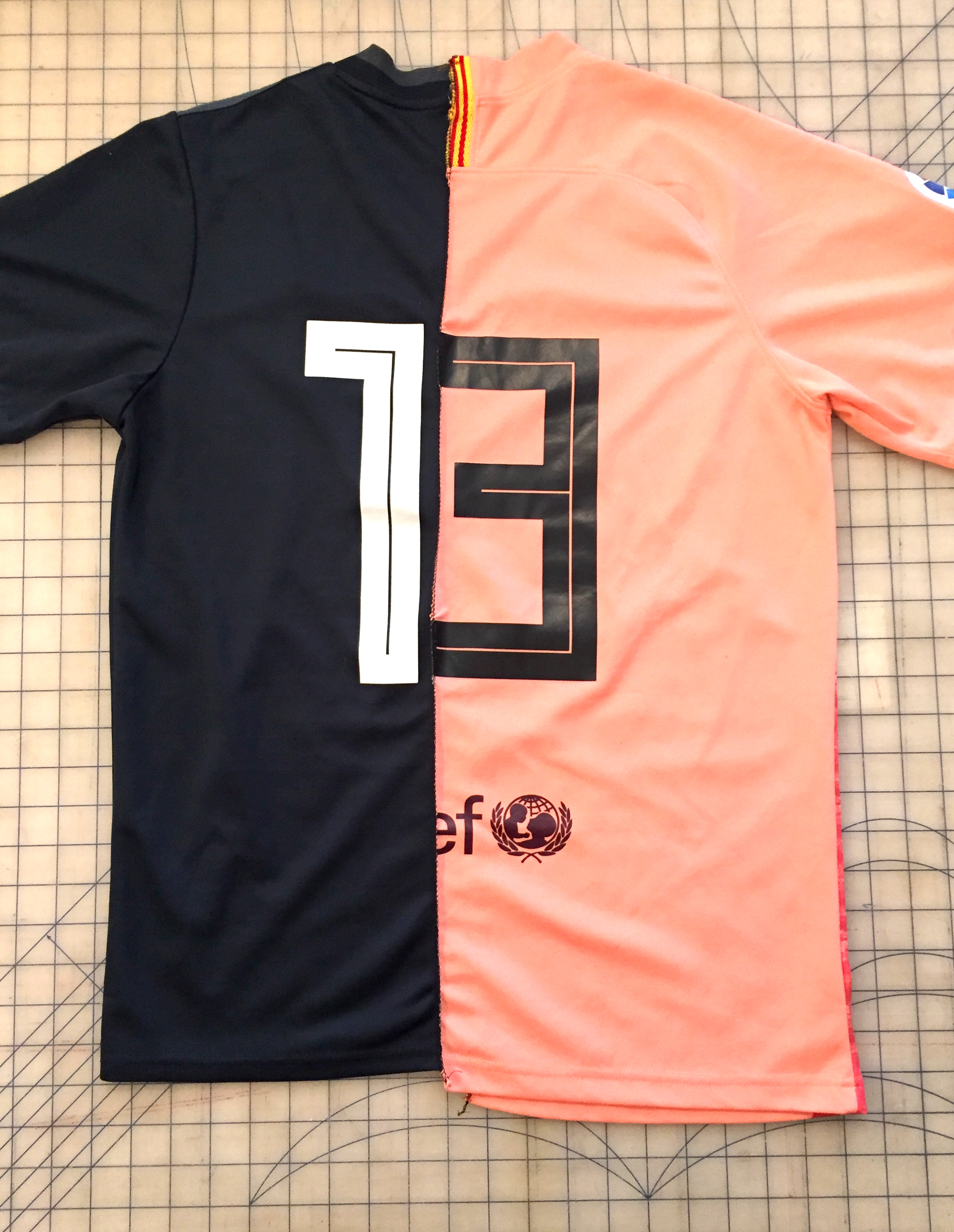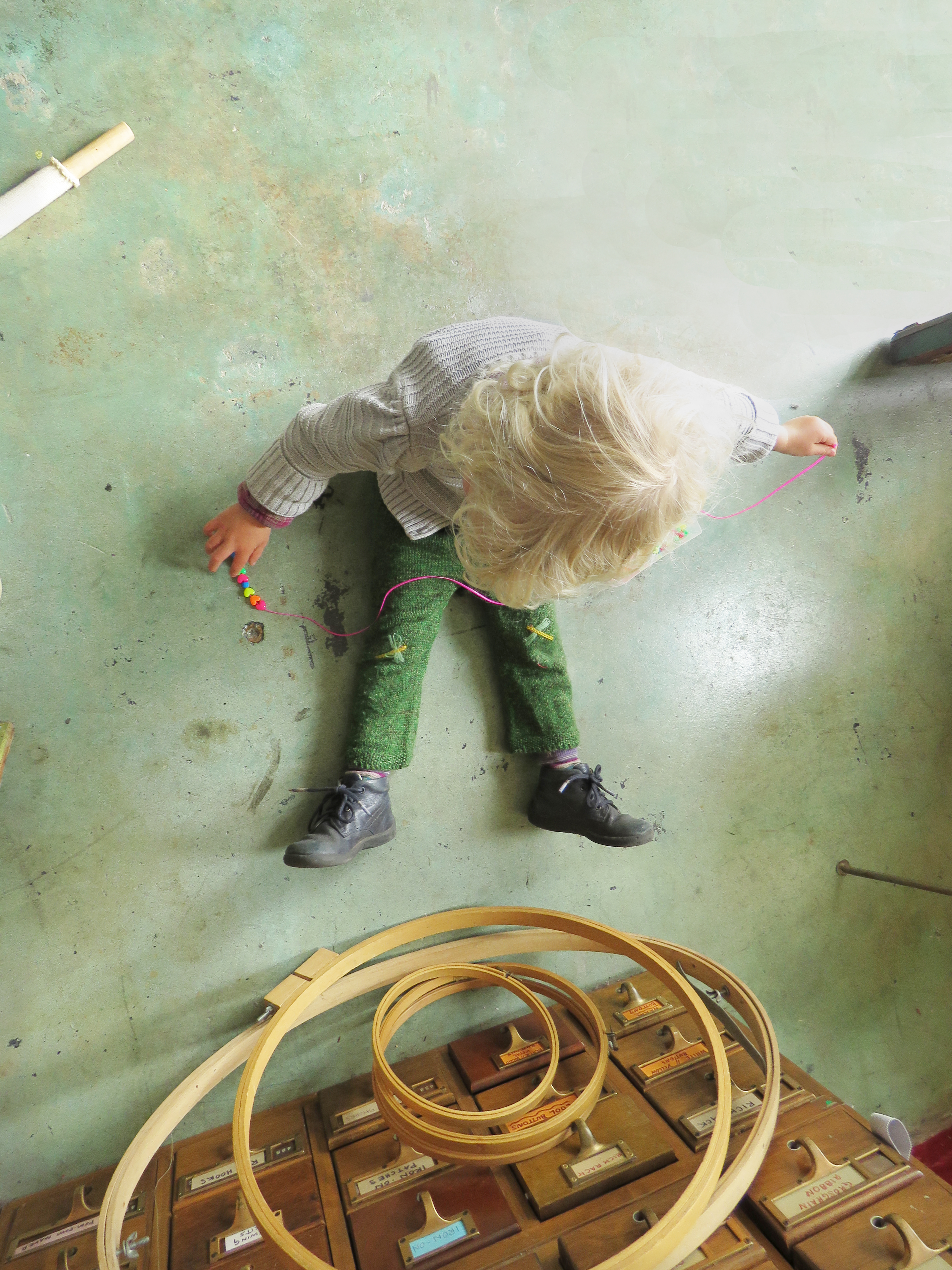 Top: Greta on the floor of the Fábrica with embroidery hoops