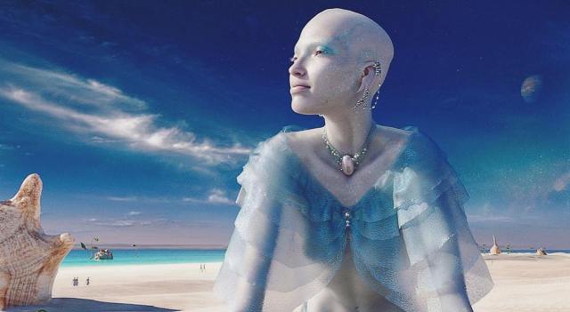 The low-tech and utopian Mül aliens, still from Valerian and the City of a Thousand Planets (2017)