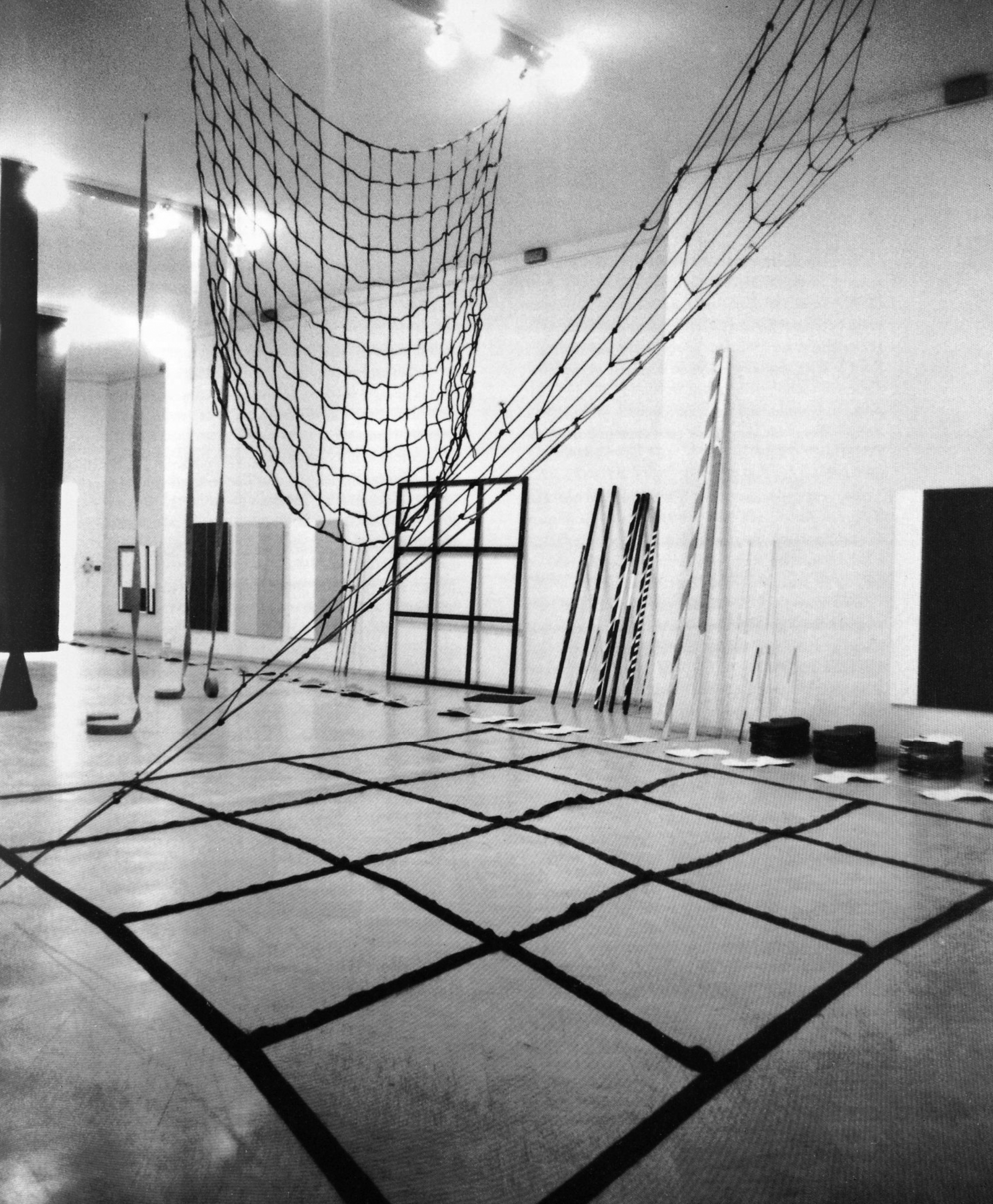 Claude Viallat.Filet. 1970. 342 x 417 cm. Image: Centre Pompidou. https://www.centrepompidou.fr/en/ressources/oeuvre/cAbKk8Right: Daniel Dezeuze, outdoor installation, Cité des Arts, Paris, 1972. Selva Journal Selvajournal.org