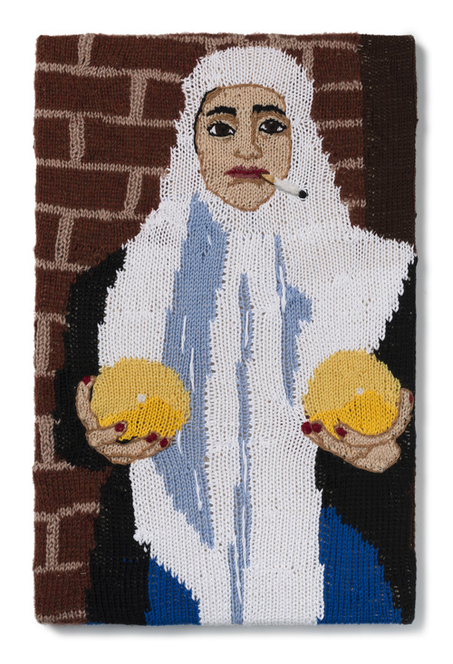The series is a reminder of the work that has been done before and is ongoing. Each self-portrait portrays not just the artist, but also the artist working to complicate narratives of identity, whether gendered, religious, or normative values. Likely, this was the goal of the project, but what comes forth most for me is a contagious spirit of admiration and a non-nostalgic version of seeing the good in the past. The work reminds me how to see something the way I first saw it, before familiarity flattened its impact. Something changes when I look at Nan Goldin with a black eye depicted through yarn. The violence of the image seems even more violent when it looks like it is cut from a festive sweater, and I’m rethinking about the original work with a new urgency.